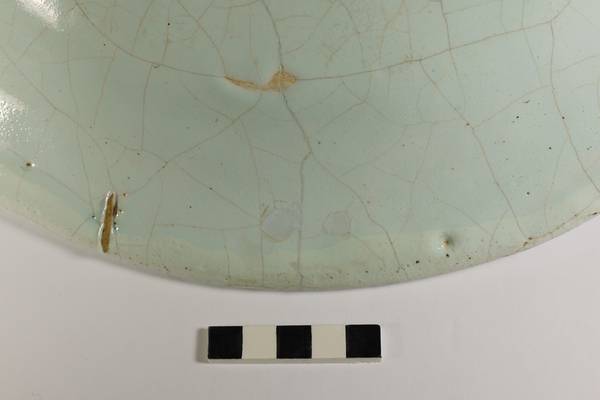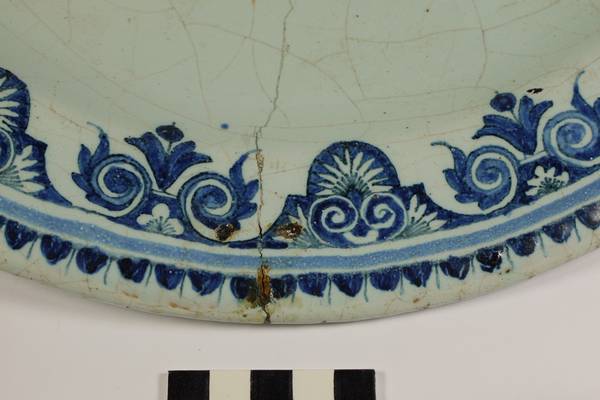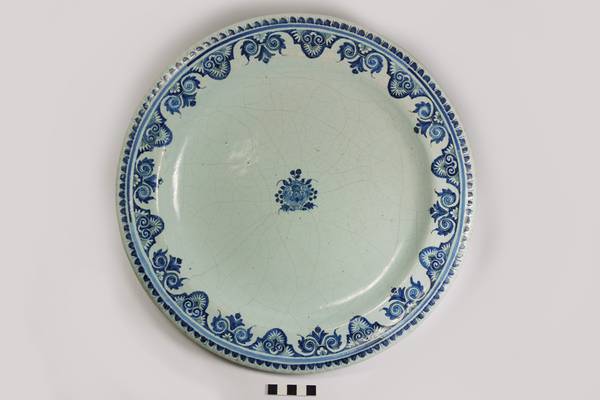 Die Fayence-Platte mit einem Durchmesser von 36,5 cm stammt vermutlich aus Frankreich und datiert ins 19. Jh. Sie wies eine alte Reparatur auf: neben einem bis in die Plattenmitte reichenden Sprung waren zwei Löcher durch die Keramik gebohrt und eine Eisenklammer angebracht worden, um zu vermeiden, dass sich der Riß weiter fortsetzte.